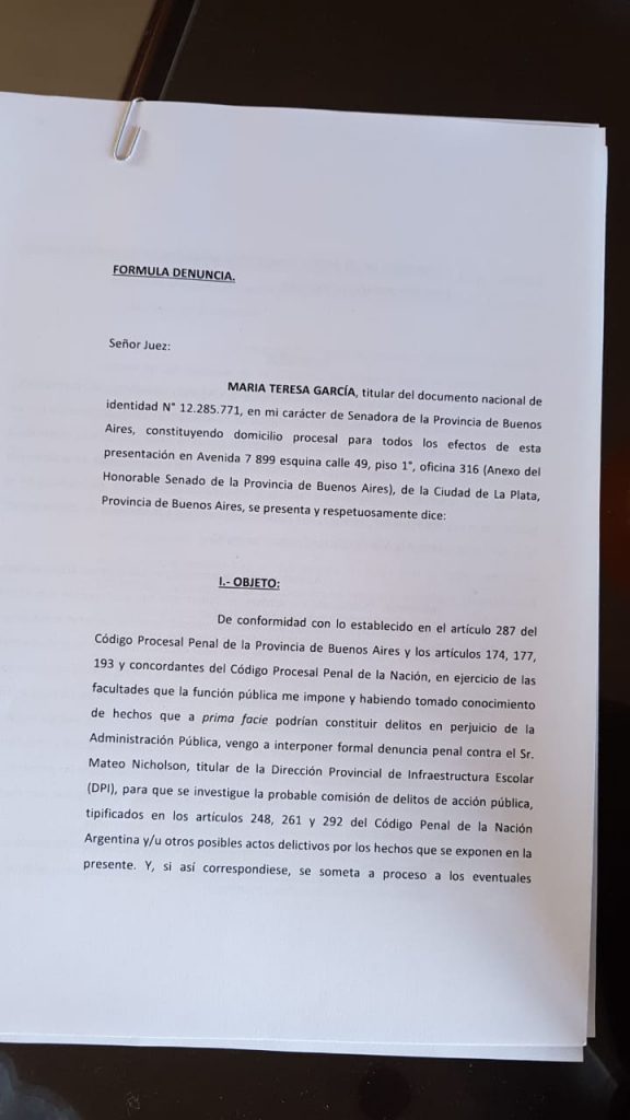 Luego de la denuncia penal presentada por la Senadora Bonaerense Teresa García, la Gobernadora María Eugenia Vidal pidió la separación preventiva del del Director de Infraestructura Escolar, Mateo Nicholson. El viernes pasado se hizo público un audio en el que solicitaba a su secretaria que «invente» presupuestos por 79 millones.
