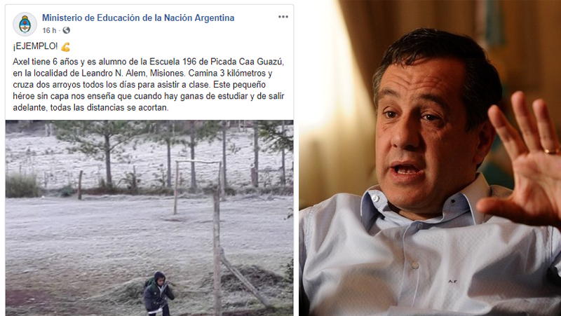 «EJEMPLO! Axel tiene 6 años y es alumno de la Escuela 196 de Picada Caa Guazú, en la localidad de Leandro N. Alem, Misiones. Camina 3 kilómetros y cruza dos arroyos todos los días para asistir a clase. Este pequeño héroe sin capa nos enseña que cuando hay ganas de estudiar y de salir adelante, todas las distancias se acortan».