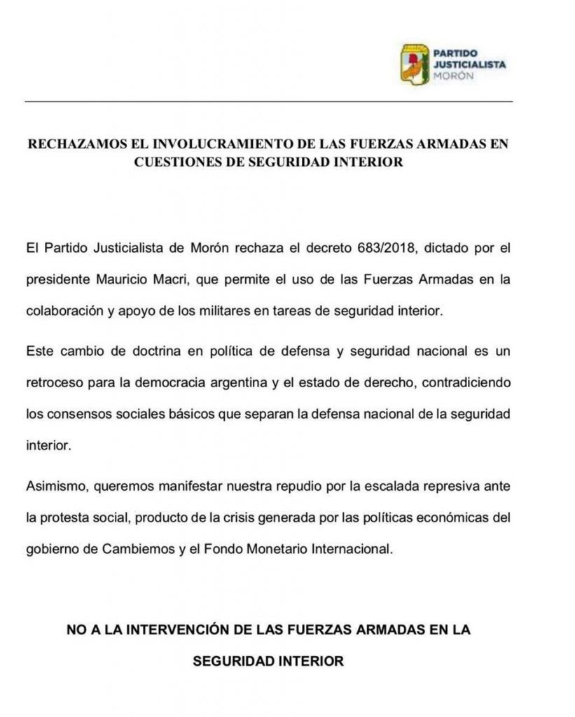 El decreto 683/18,  autoriza la intervención de las Fuerzas Armadas en seguridad interior y deroga el decreto 727/06, firmado por Néstor Kirchner, que lo impedía.