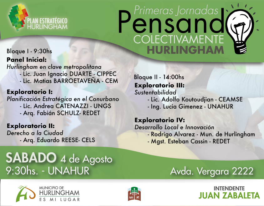 Las jornadas serán coordinadas por Lautaro Aragón desde la Unidad de Gestión para la Planificación Estrategia del Municipio de Hurlingham, contarán con la colaboración de Fundación Compartir, la entidad local que trabaja con experiencias colaborativas en políticas públicas, y REDET que nuclea profesionales del ámbito académico para generar prácticas y experiencias en el desarrollo territorial.