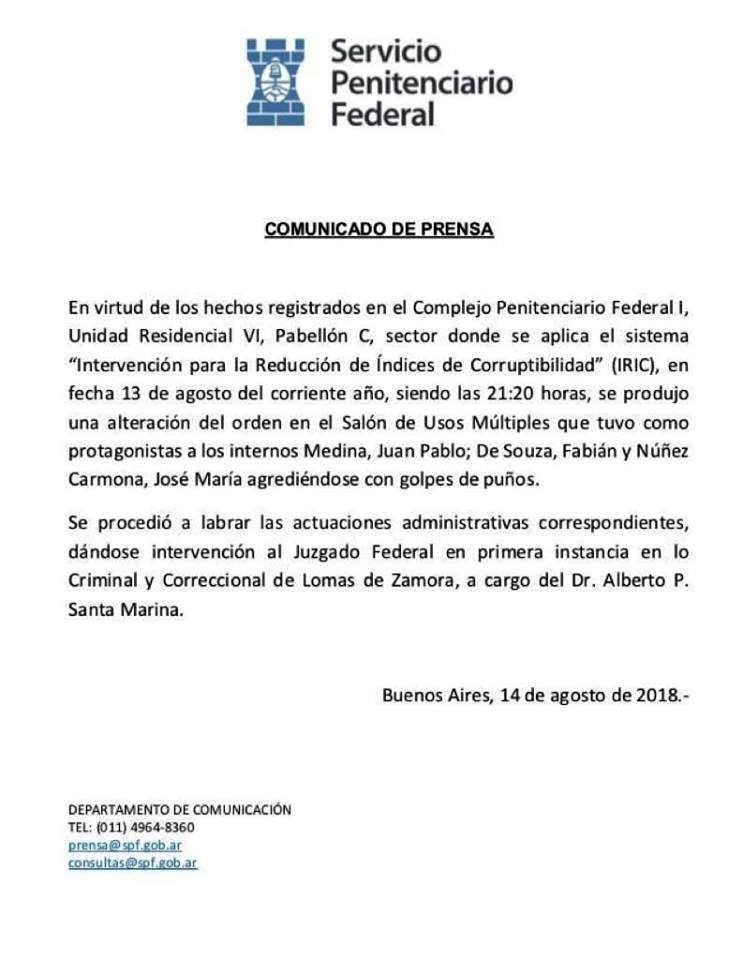 El Servicio Penitenciario Federal PF informó que se «procedió a labrar las actuaciones administrativas correspondientes, dándose al juzgado Federal en primera instancia en lo Criminal y Correccional de Lomas de Zamora, a cargo el Dr. Alberto P. Santa Marina».