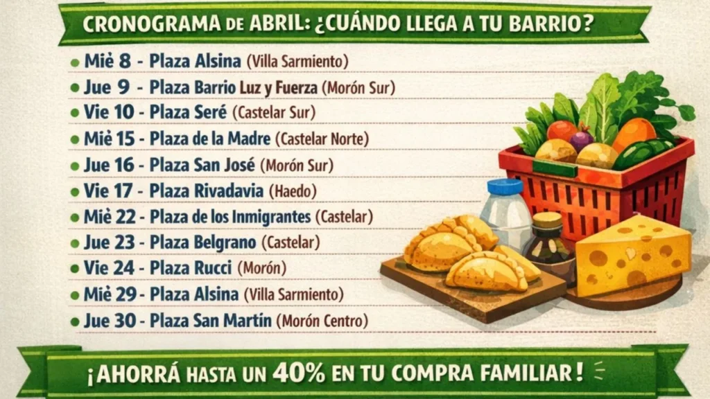 La rotación de los mercados asegura que todos los puntos del partido tengan acceso al beneficio. Las ferias bajo costo visitarán 10 plazas diferentes, desde Villa Sarmiento hasta Morón Sur, siguiendo este calendario: