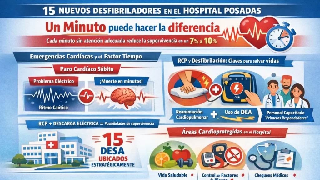 En una apuesta decisiva por la seguridad, el Hospital Posadas ha reforzado su capacidad de respuesta ante emergencias cardíacas con la adquisición e instalación de 15 nuevos desfibriladores. La importancia de esta medida radica en un dato científico irrefutable: en un evento de paro cardíaco súbito, cada minuto que pasa sin atención adecuada reduce las probabilidades de supervivencia entre un 7% y un 10%. Por este motivo, la creación de Áreas Cardioprotegidas dentro del centro de salud se vuelve una herramienta de vida o muerte. La presencia de estos equipos DEA permite que la primera persona capacitada que presencie el colapso intervenga de inmediato, aplicando una descarga eléctrica si es necesario, mientras el equipo de salud especializado llega al lugar del incidente.